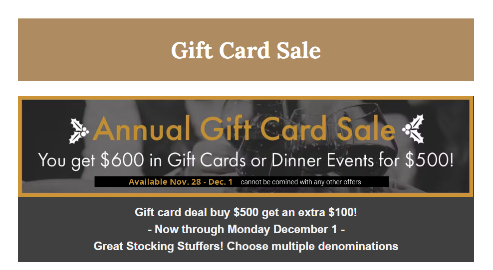 Get $600 in Gift Cards or Dinner Events for $500 !